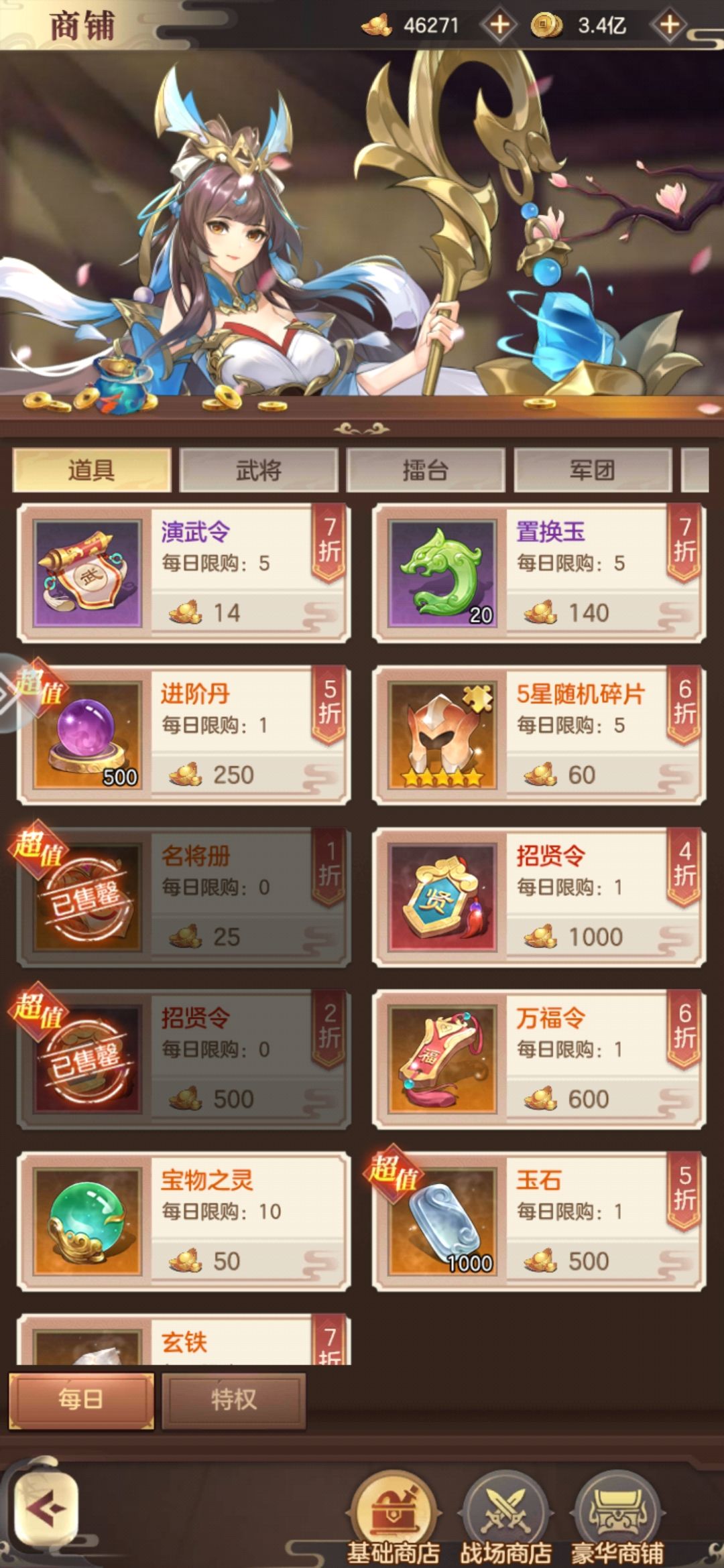 将军府商店:买自己核心输出名将,不要45和以下的,血亏。