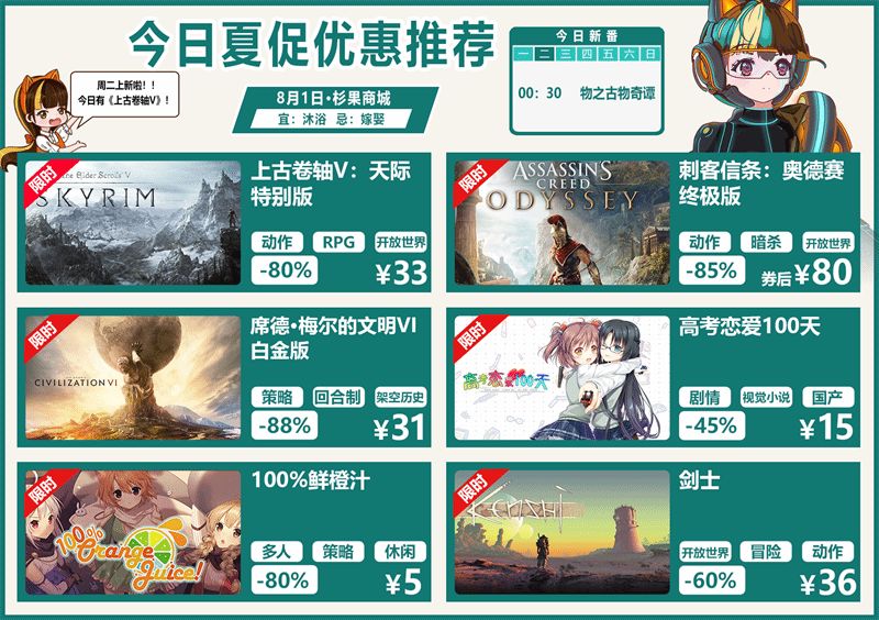 杉果“720夏促”特惠如火如荼进行中!全场数千款游戏集体平史低,叠加满减券后轻松击穿 Steam 史低!每日 24 小时限时折扣更是不容错过,超值折扣不必担心背刺。是不是已经怦然心动?那还等什么,快来杉果杉果“720夏促”特惠看看吧!