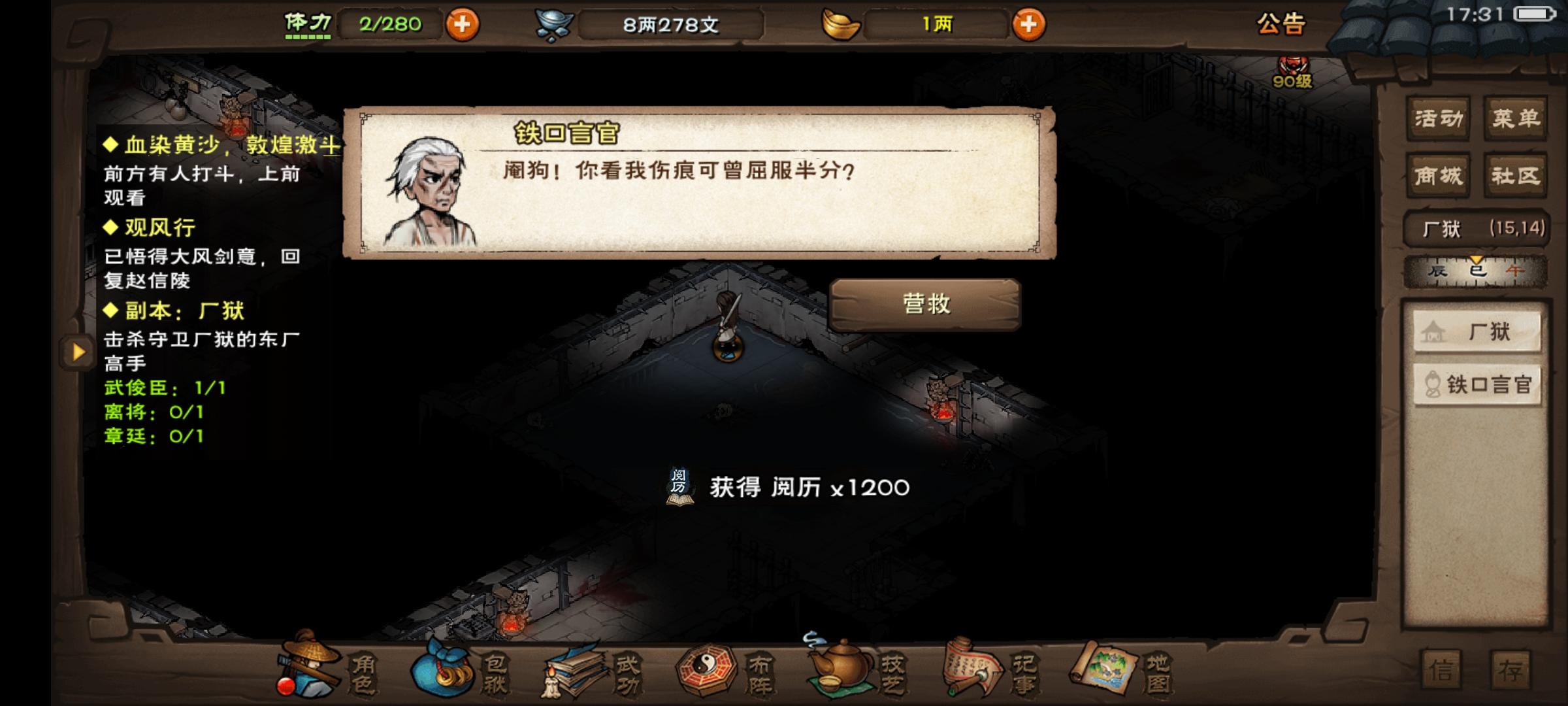 综上个人感觉燕王府二刷的价值比厂狱来得高。毕竟燕王府洗髓顺脉没有上限,爆率也较高。厂狱基本就武俊臣能爆个洗髓碧灵之类。加上囚徒银两后,二者皆是8个怪,获得的银两数应该是差不多的,阅历燕王府高点(多一个boss,且boss给的阅历比厂狱高点)