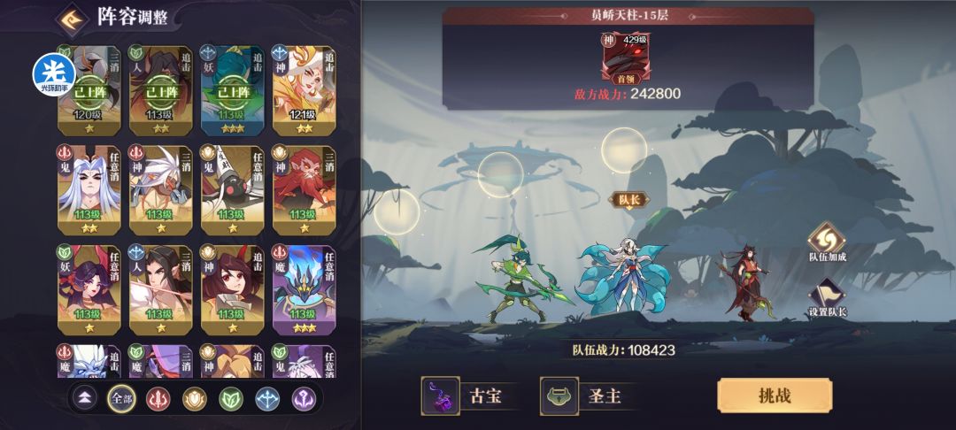 首先先上图,如题所示,我所推荐的阵容是以神农九尾狐为核心的打法,神农的核心为触发消除技增加一个队长块,而九尾狐的核心是三消时增加三个不同的主力块。这就形成了一个自循环的套路,而在此二人的辅助下,输出核心只要是队友三削时触发就会达到最大化收益,我这边比较推荐的就是小金乌跟草妖,不过草妖暂时用不了,存在触发bug,等修复了,其输出不弱与同星级的小金乌。当然除了这俩个之后还有睚眦跟其他队友三消触发英雄。但就阵容来说,小金乌跟草妖是更适合这个阵容的。