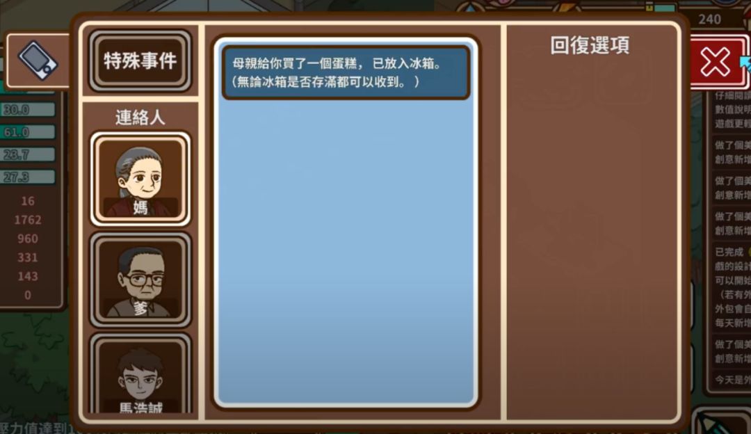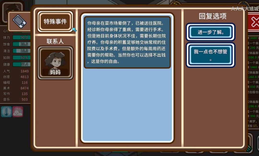 比如,文章开头所说的母亲患病剧情。如果玩家在前期从妈妈手里要了太多钱,或者不能支付高昂的药物费用,妈妈很容易手术失败,最后去世。
