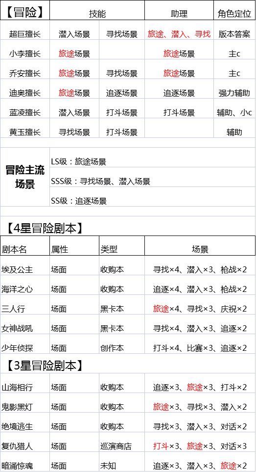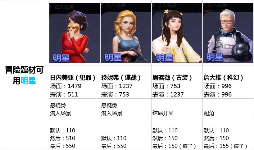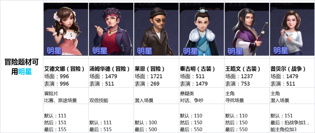 3.能提供双倍技能的明星 4.当前冒险题材热门场景自己能强行出演的