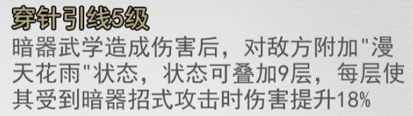 暗器:玄机弹指,赤练玉流针,日月万光神针,阴阳逆行针,五弦连珠镖,飞花摘叶镖
