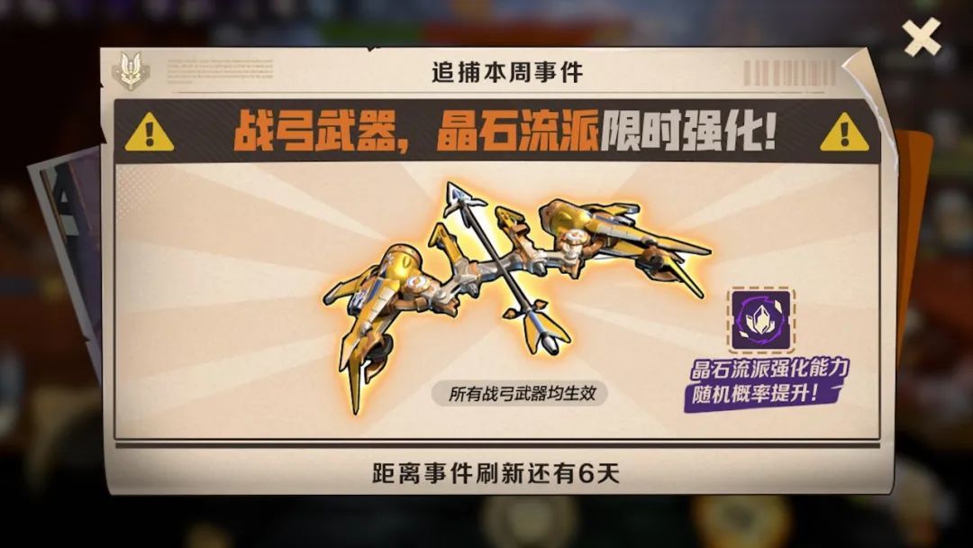 晶石流派能为大家提供两种输出方式,不仅有能够极大增强大家近战能力的水晶石阵,还有与深渊裂隙类似的晶石飞弹帮助大家击杀远处的敌人,同时,在晶石流派上线后,它将限时联动战弓类武器,携带战弓拾取晶石能提升小队攻击力,让你的追捕之路更顺畅!