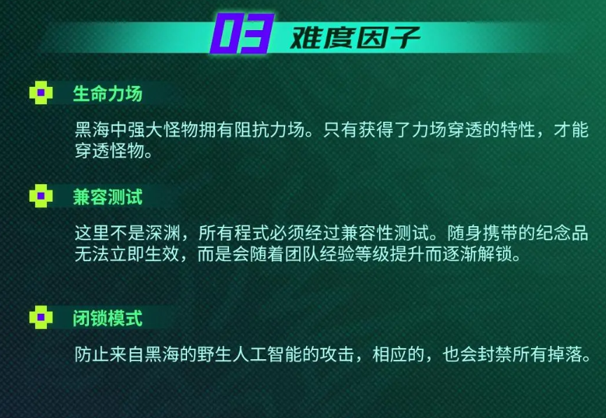 这张图片主要讲的是难度因子啊,难度因子有三个因子生命力场兼容测试闭锁模式
