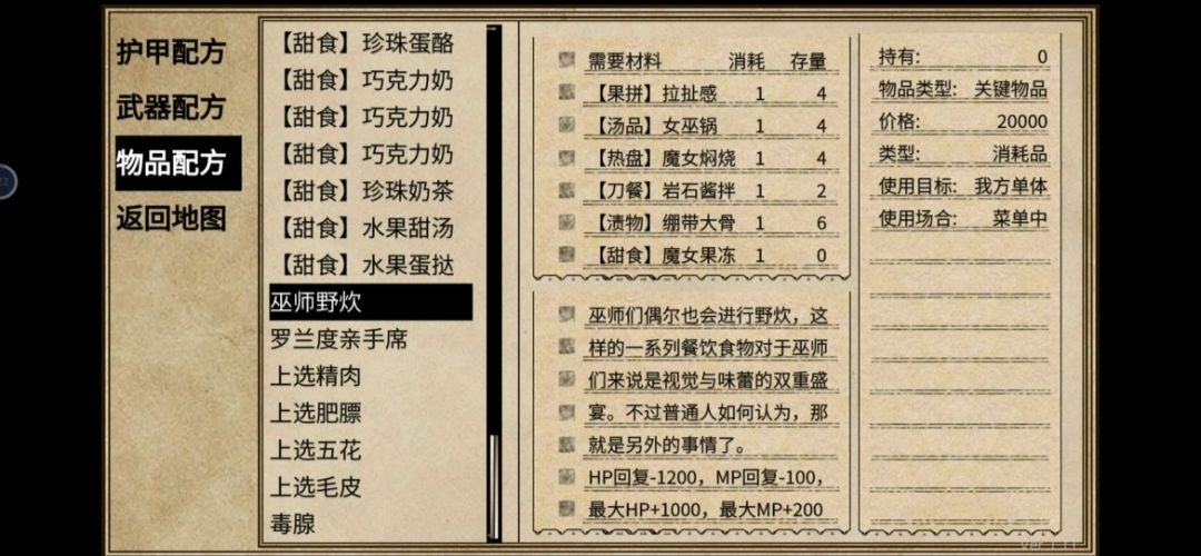 游戏的只游戏的自由模式,我非常喜欢,很少现在有这种比较清新的RPG,就是说里面的故事内容插入的比较多的,但是我又不想以看小说的模式玩游戏,这种插入型的我是比较喜欢。然后先在这里放一张游戏我目前看到最强怪物的图片,这个东西是真的太难,开了挂一般来说也不会打ヽ( ̄д ̄;)ノ,我还是提了属性才过的(真的是作者他奶奶也打不过呀!)新手开局最好是招一些队友,虽然荣誉单挑让一些战斗变得简单,但是对于这种boss型的怪物,你需要一些队友。这个游戏的核心玩法其实是通过刷食物获得的固定属性值来击败敌人,那些成长宝箱给的数值实在是不太多,这种套餐类型可以提供永久数值的饭菜,其实是有三种的,目前我暂时提供两种贴图,另外一个找不到。这篇攻略会持续更新,因为实在没有人会生产这个游戏的攻略,只能说是用爱发电。另外值得一提的是,234张图中是新手前期推荐去的一个点位,先将双倍金币值这个天赋点出来,会让你在购买食材的时候更加轻松。