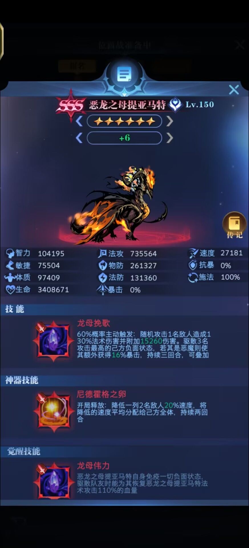 5. 用来挡风雨和血爪,龙母是不吃任何负面的,且自身攻击本就高达73w。风雨的暴击是依靠标记触发的,当风雨打龙母时,挂不上标记,没法暴击伤害就会少很多;而血爪同样的道理,血爪挂不上负面就没法链接伤害给己方,防止c为被自己打死。