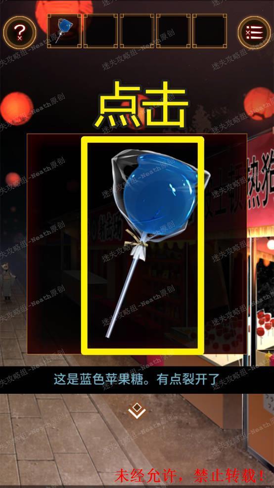 6、到右边摊位,点击苹果糖摊位,移开第二根苹果糖,拿走后面的【蓝色苹果糖】,在道具栏放大,点击一下,得到【棒棒糖】和【苹果糖碎】。6 6.1