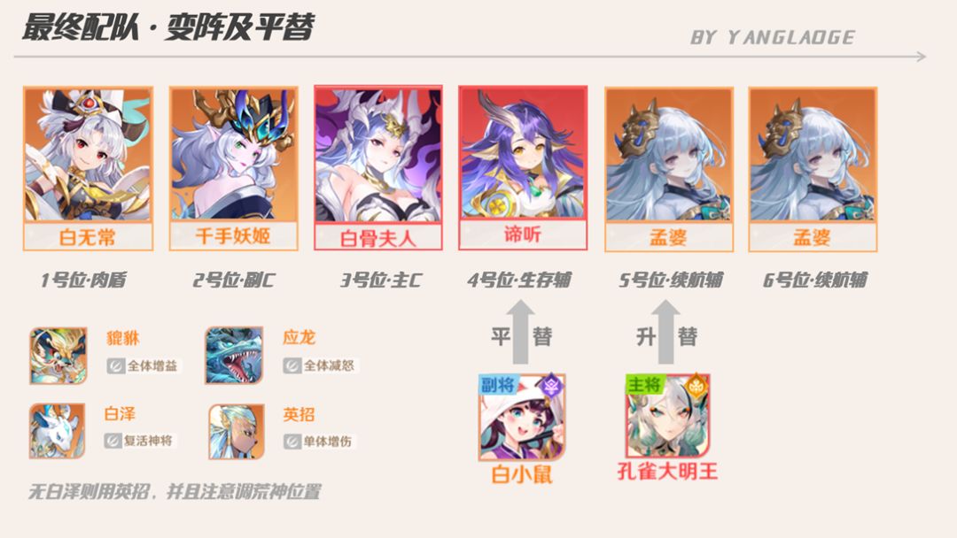 ②布阵站位上,若对方有控制技能(如天帝),可考虑千手妖姬和白骨错开2排放置,避免白骨把攻击目标引过来控到妖姬,可以让谛听和白无常吃控制。同时需要注意站位让主C或副C准确吃到英招的技能。