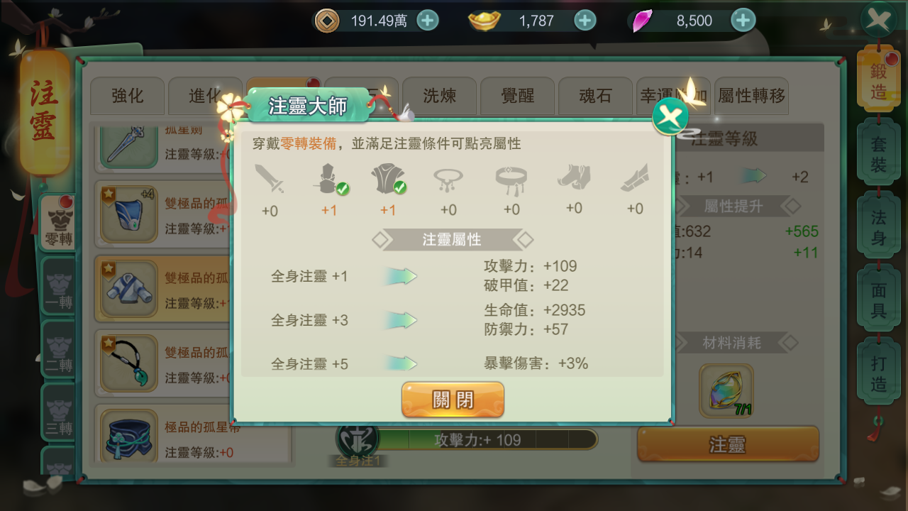 注灵石只能通过勾玉购买获得,点击注灵后可以为装备进行注灵,注灵不仅可以获得海量属性,当全身注灵等级达到一定条件时,还能启动注灵大师的属性。
