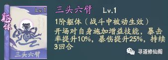 三头六臂:开场对自身施加增益技能,暴击率增加10%,爆伤提升25%,持续3回合;