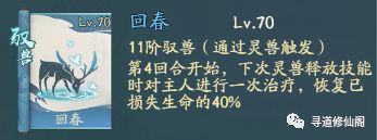 回春:第4回合开始,下次灵兽释放技能时对主人进行一次治疗,恢复已损失生命的40%;