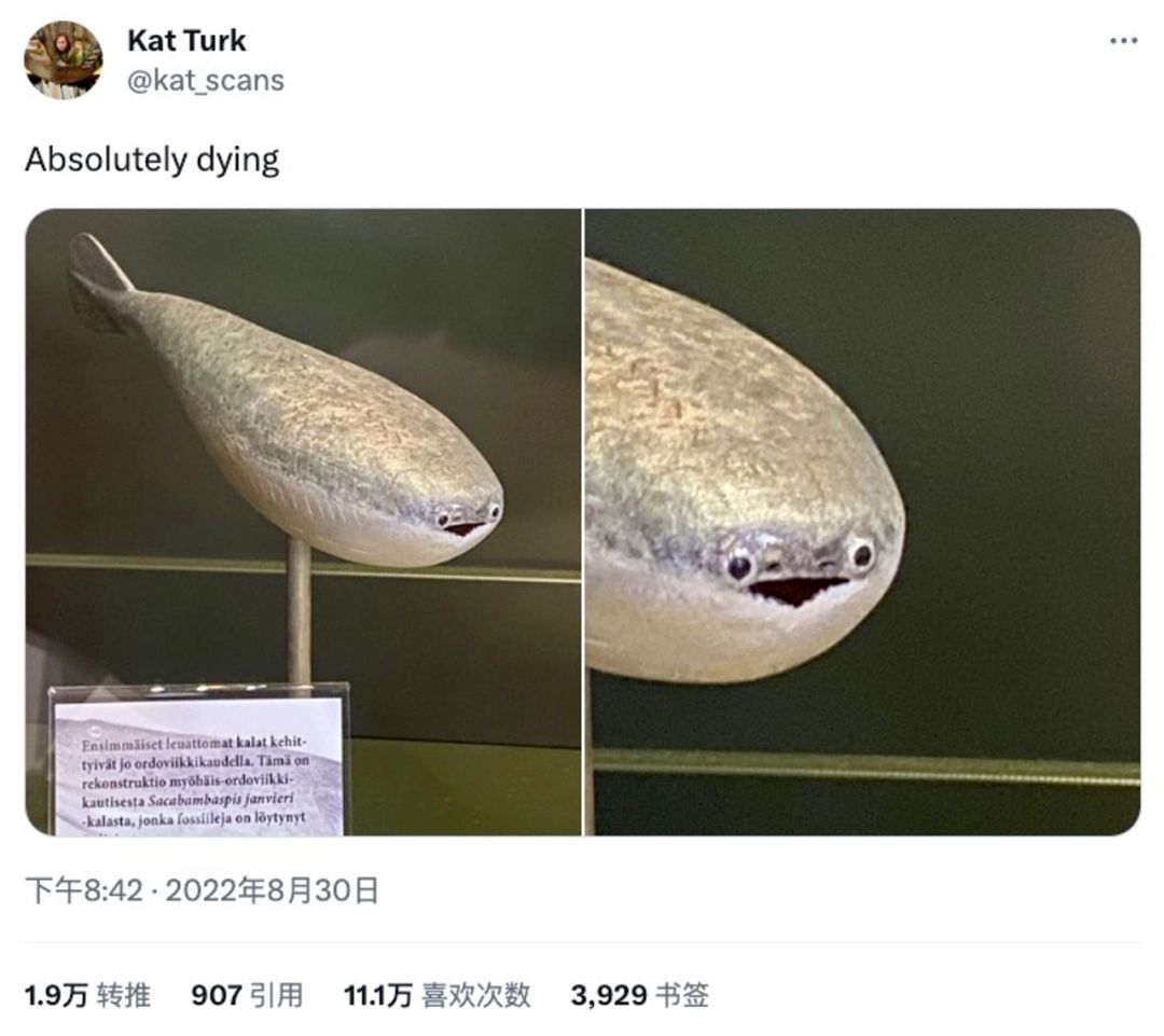 古生物博士Kat万万没想到,自己在2022年无意间拍摄的照片,竟然能成为爆火全球的网络热梗。这只萨卡班甲鱼的复原模型,位于芬兰自然历史博物馆。它活跃的时代,距今约4.68亿年。推文还特别强调了“absolutely dying”,完全灭绝。但此时此刻如果有一个外星人学会了网上冲浪,估计会发现一个特别震惊的事实:这鱼不仅没绝种,而且在大家的手机里面,活得好好的。