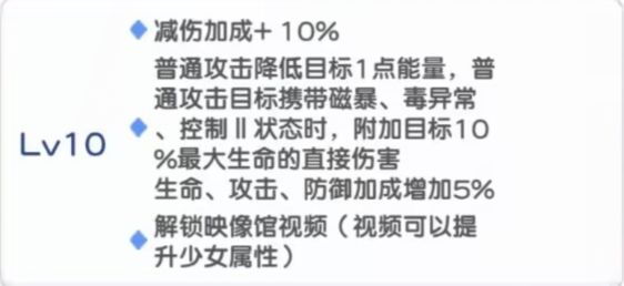 哀怜的四星觉醒是一个减能的控制,二星觉醒的反击普攻虽然不能触发回能,但是可以触发四星的减能效果,这样即便一枪没捅穿对面输出少女的胸膛,也能带走她一块肉,绝大部分少女还是离不开能量的呢。