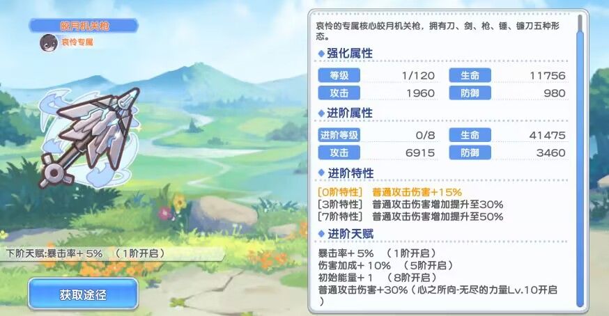 外观看起来有点像君莫笑的千机伞,但她强度也确实有这么高。7阶皎月机关枪特性50%的普攻伤害加成,心之所向一30%的普攻伤害加成,这么一加上去就已经上天了,如果再来个普攻印记(普通攻击印记:普通攻击伤害加成20%),又是20%的加成,总共100%普通攻击伤害加成,试问这一枪,能不能贯穿星辰!