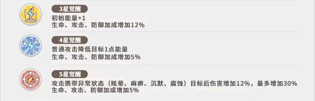 五星觉醒的效果就是很单纯的增伤,数值也不错,不过跟二星觉醒的效果一样,有个前置条件,那就是攻击或者被攻击携带异常效果的目标,这些异常效果包括磁暴,毒异常(剧毒,腐蚀),控制二效果(麻痹,眩晕,沉默)。这其中数磁暴是最好挂上呢,毒异常和控制二要么不稳定,要么就是控制数量有限,等到讲解配队思路的时候陌陌再来细说。
