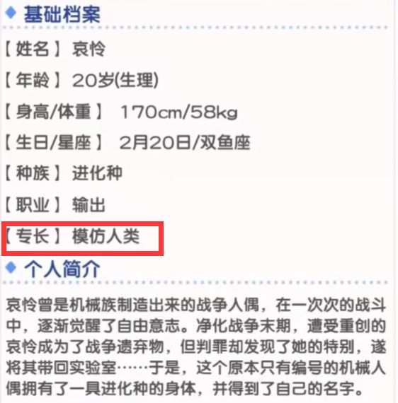 她为了战争而生,曾经的记忆只有无数的冲锋陷阵与返厂维修,忠于机械族,但在最后却又被机械族无情抛弃。基本资料里能看到哀怜的专长是模仿人类,但咱认为这是哀怜想要这么做,她想要成为人类,但造(策)化(划)弄人,她只是从机械人偶变成了进化种,有人的理性却没有成为人,或许在别人看来她是恐怖的战争兵器,但在陌陌看来,她就是个害怕孤单的小女孩儿。