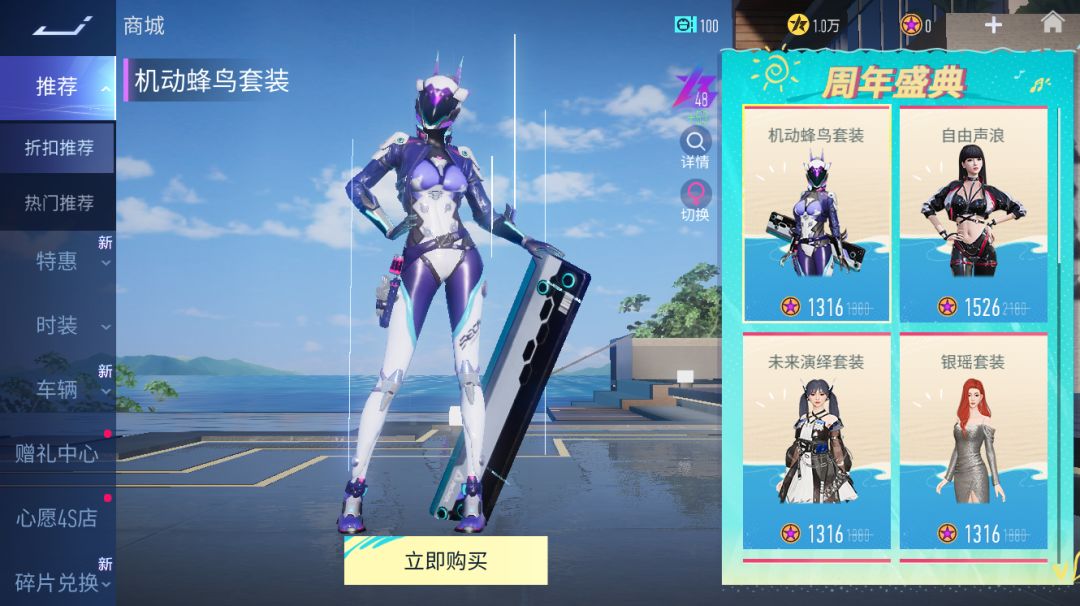 [9] 『周年折扣』 7月28日~8月10日,周年折扣惊喜开启!自由声浪、机动蜂鸟等时装,闪耀神剑、君意如鸿等涂装,悦音缭绕、瑶台金钗等轮毂均开启限时折扣,心动不如行动,快前往商城查看吧!