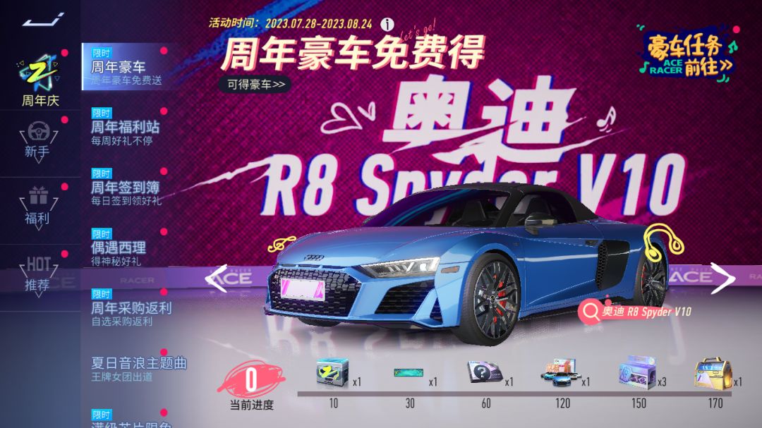 [1]『周年豪车』周年豪车免费得!7月28日~8月24日 完成豪车任务获得周年积分,解锁相应进度奖励。豪车奖励五选一:奥迪 R8 Spyder V10、玛莎拉蒂 Alfieri、布加迪 Chiron、柯尼塞格 Regera、帕加尼 Huayra。