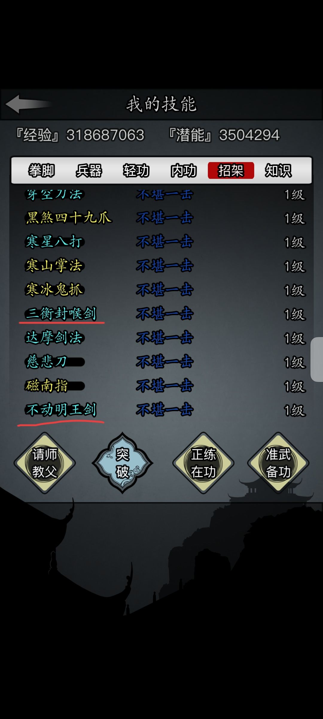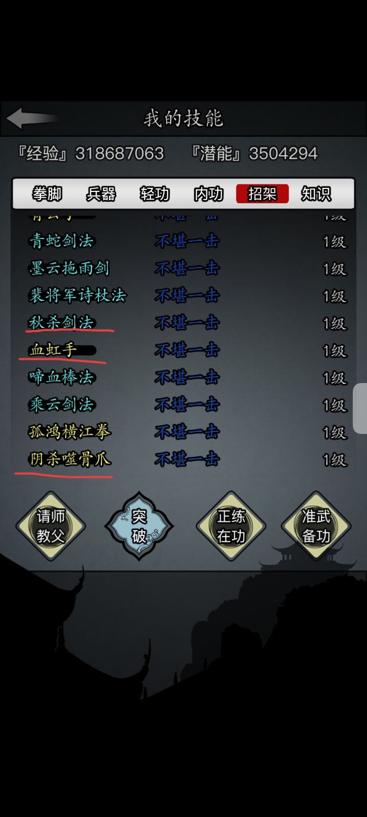 蛇狡手、血虹手、青云手、无形指、阴杀噬骨爪、聚阴蝎爪、不动明王剑、三衡封喉剑、秋杀剑法、西岳三神剑、绮音箫绝剑、浪行醉刀