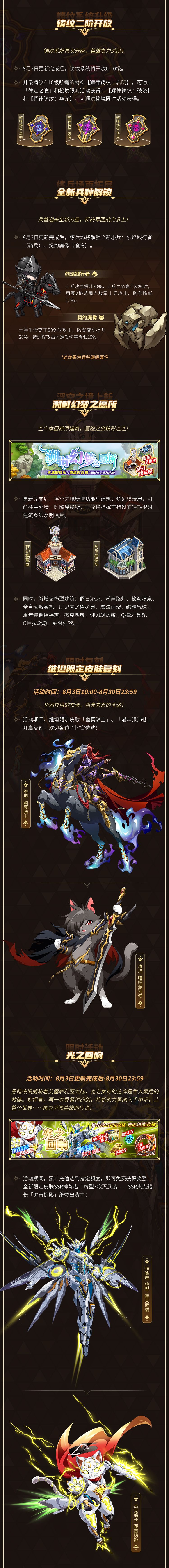 服务器预计将于8月3日1:00-6:00期间进行更新维护,在维护期间指挥官们无法登录游戏,给您带来的不便敬请谅解,由于本次更新包体较大,在更新维护完成后,指挥官更新速度会较为缓慢;光辉军团将为所有指挥官发放圣魔券*5作为补偿。