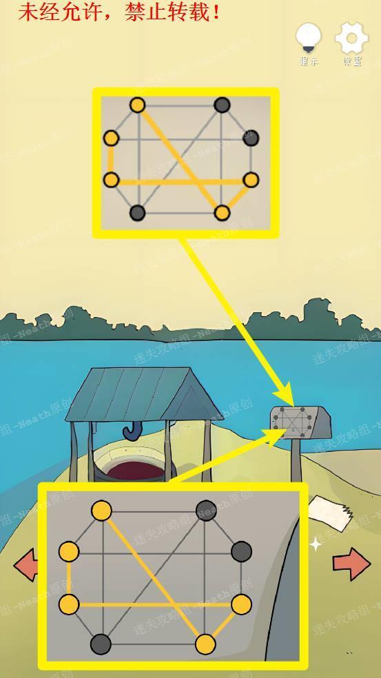 16、向右移动到水井场景,根据城堡墙上黄色的线段在路牌上画出线段,阅读纸条。16