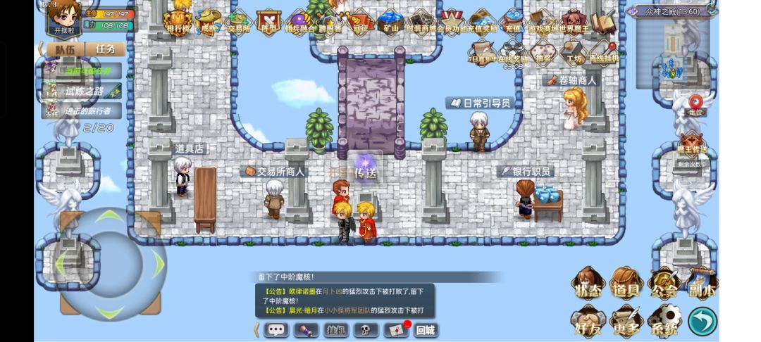 再顺着门口走下去,来到太阳城坐标(5,40)向左走出城,再来到坐标妖精平原(79,119)在旅行商人出拿着主线领的金币买一瓶2级魔法瓶,然后点击下方回城键回到众神之殿,找到进击的旅行者交付任务。