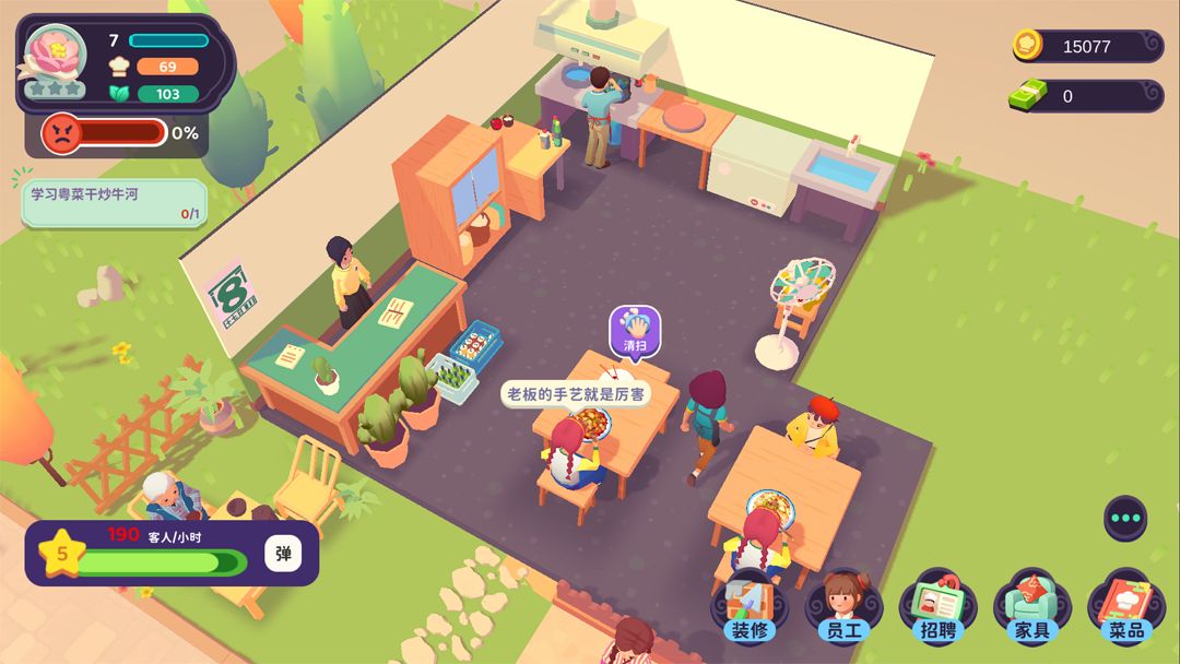 清理:在客人走后桌面上会出现清扫气泡,清扫好桌子下一位客人才会来,所以一定要记得及时清理。