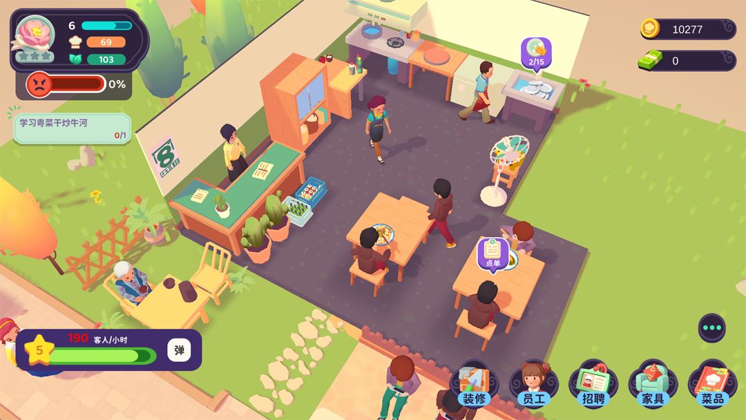 随着你招待的客人越来越多,餐厅积攒到一定的口碑时,你就可以通过招聘服务员和厨师来加快照顾顾客的速度,身为店长的你就可以解放双手啦!
