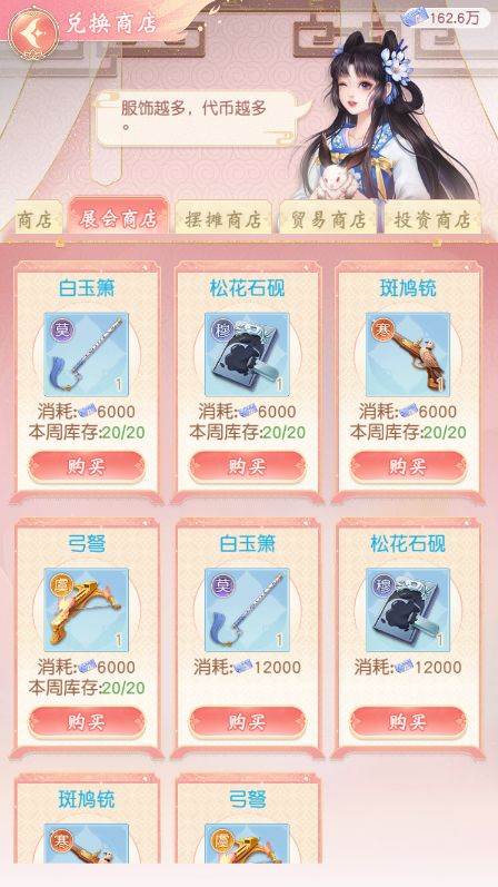 掌柜获得服饰展票后可到展会商店进行消费,给我们的蓝颜购买礼物,提升与他的好感度,每周会有限购的5折礼物出售,建议每周优先购买折扣。