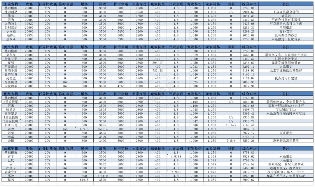 - PS1:没被提及的宠物是不推荐使用的奥