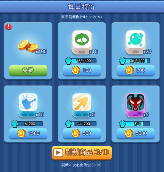 每日特价里刷新商品20次必出传说骰子,玩家可以直接用金币购买。