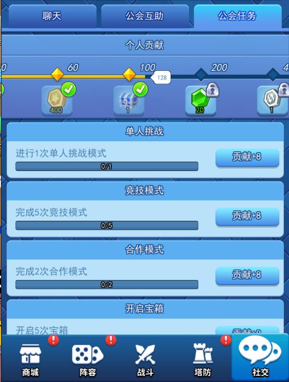 完成工会里的任务可以获得贡献值,当贡献值达到一定数量时就可开启宝箱。