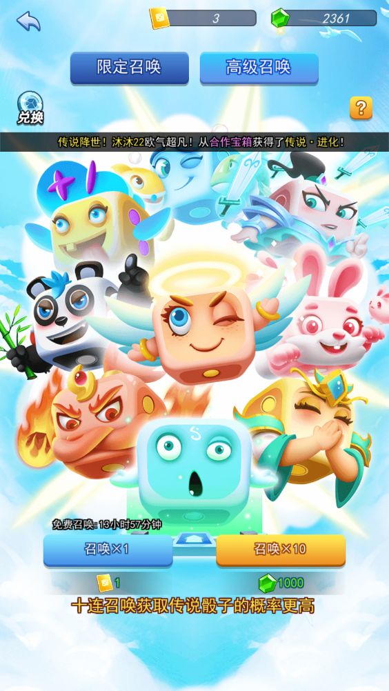 每天有免费次数召唤传说骰子,收集钻石和召唤券也可召唤,累计召唤积分还可免费兑换传说骰子。在前期,钻石和召唤券的获取途径非常多,任务也比较简单,十连还是可以轻松白嫖的。