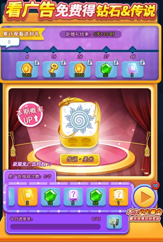 玩家可观看广告获得转盘抽取次数,有概率抽取到传说骰子。