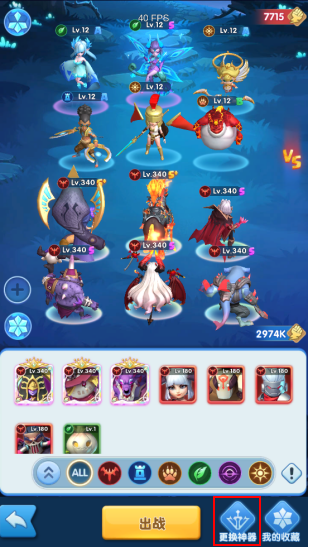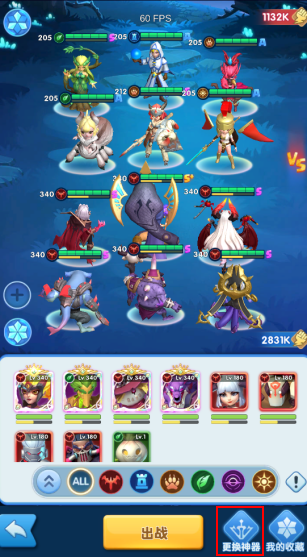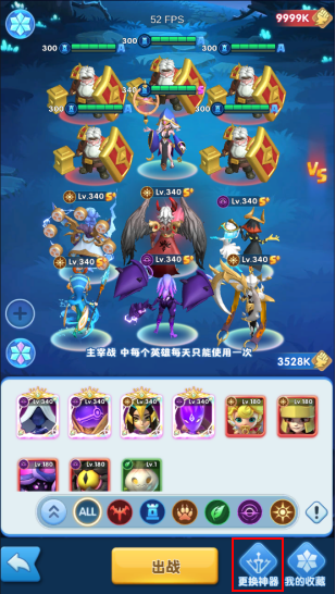1、 快捷更换神器:玩家可通过点击该按钮更换出战英雄的神器,也可以给未穿戴神器的英雄穿戴神器(通关主线关卡20-1后开启)