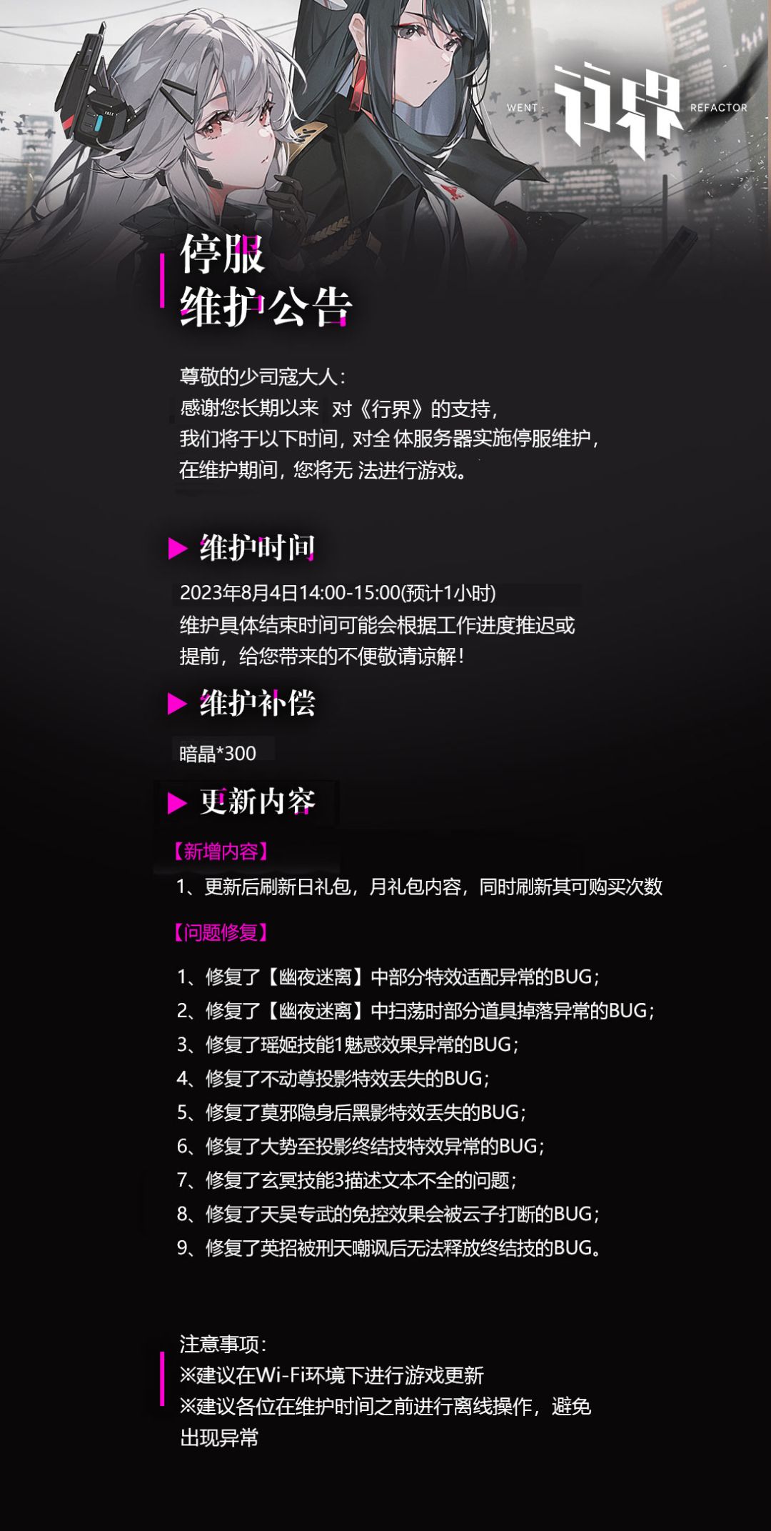 感谢您对《行界》的支持,我们将于以下时间,对全体服务器实施停服维护,在维护期间,您将无法进行游戏。
