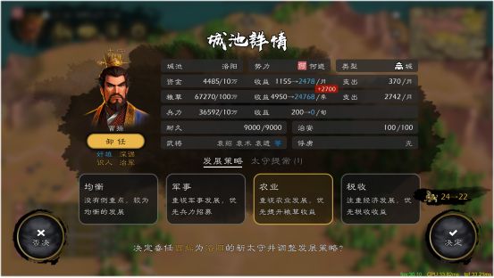最后,选择太守和发展策略,会不同程度提升每个季度的资金产量。太守的“智”属性越高,资金的收益就会越高。