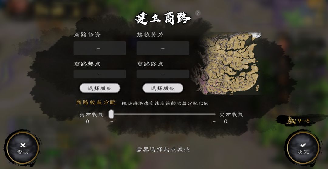 商路:自势力城池有特产时,可建立商路增加城池资金,也可以和其他势力建立商路互通有无赚取金钱,商路有数量上限可通过科技增加。