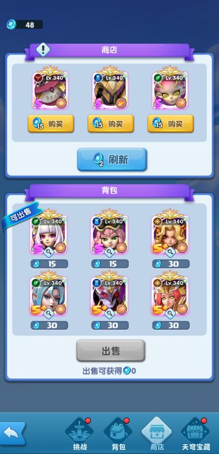 4.玩家在每次竞技中,第一回合挑战胜利后,将开启商店,用于购买或出售该次竞技中可使用的英雄和神器。
