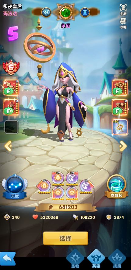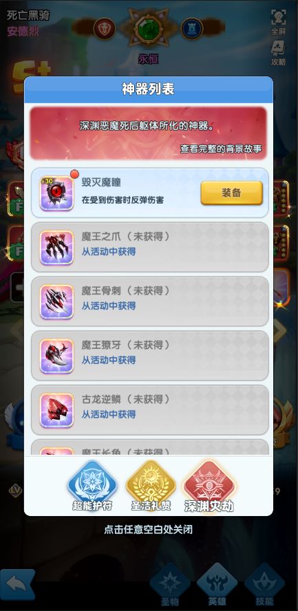 穿戴神器:点击英雄进入详情页,点击神器一栏的”+“号,即可选择穿戴已有的神器