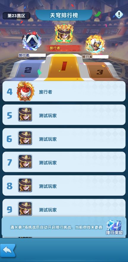 3.玩家每场竞技胜利7场后都可解锁一次“排行挑战”,“排行挑战”每日刷新,未消耗次数不保留。每次排行挑战中,玩家拥有10次挑战机会,胜利或失败都将消耗挑战次数。