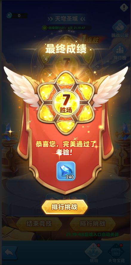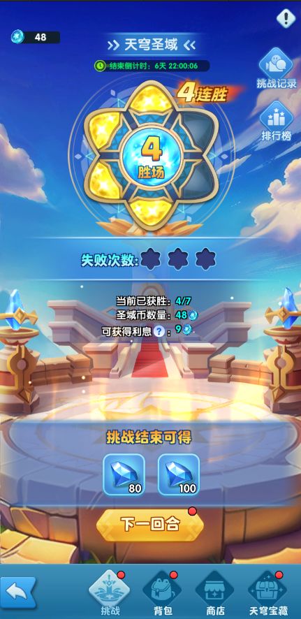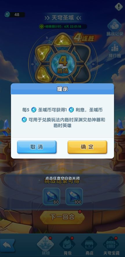 3.挑战胜利后可获得【圣域币】与【随机一位英雄或神器】作为奖励,并可选择进入下一回合