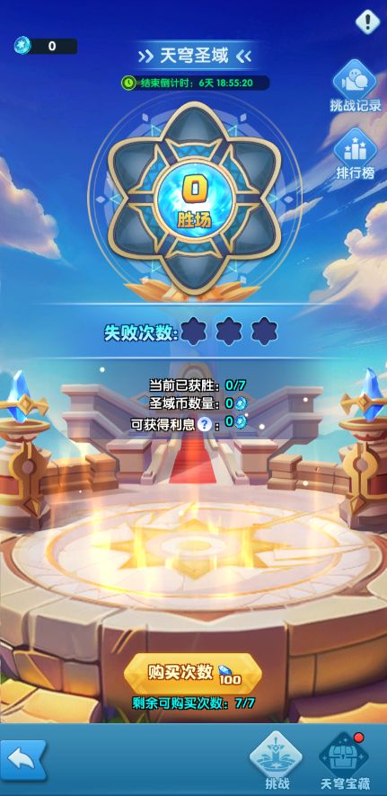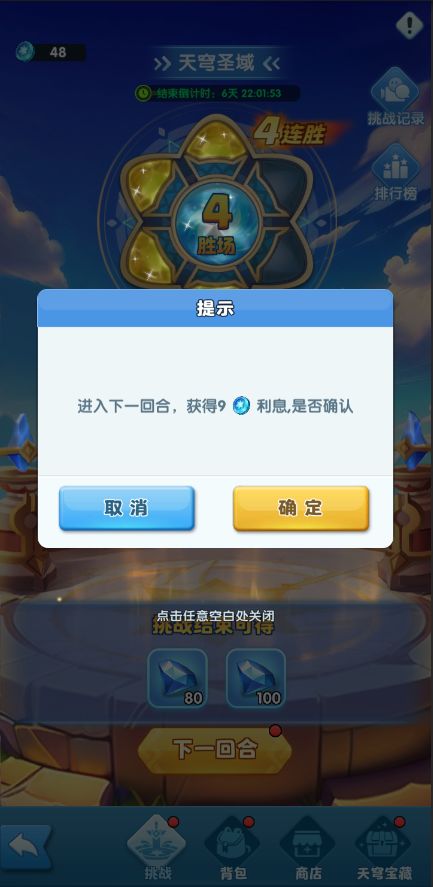 5.玩家每次竞技(门票)中,每回合挑战胜利后,可选择进入“下一回合”,选择进入“下一回合”后,会根据自身当前持有的【圣域币】获得一定比例的利息奖励,且商店自动刷新一次