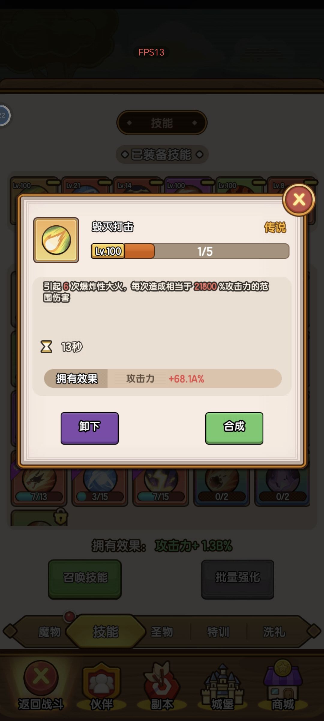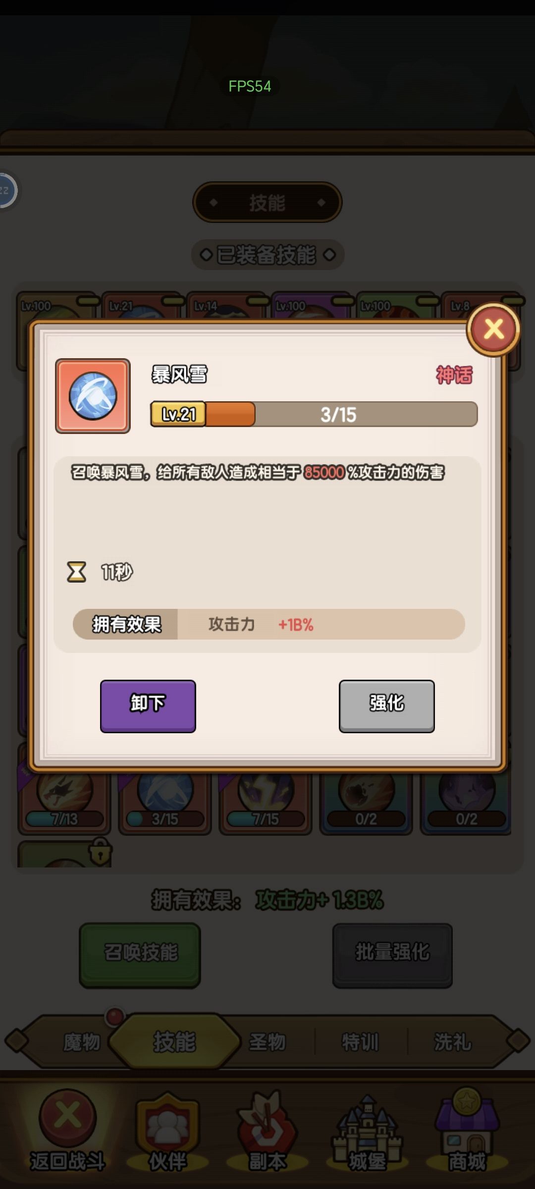 其次是技能,橙色技能等级对战力加成我觉得微乎其微,作用可能主要是打怪,但红色依然给了我惊喜,20级的暴风雪加了1b的攻击。