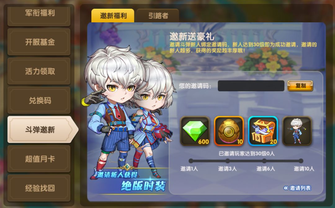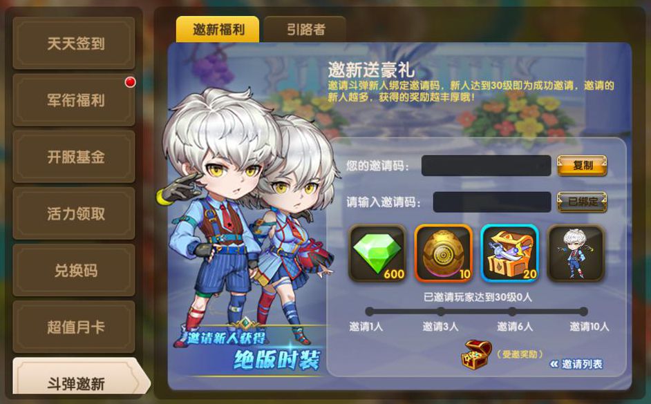 已经在斗弹大陆游玩了一段时间的勇士们,可以在【斗弹邀新】活动里看到一串【我的邀请码】,把邀请码序列发送给受邀请的萌新,可与斗弹新人进行绑定~(新人达到30级视为成功邀请)