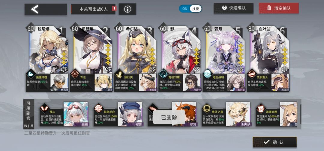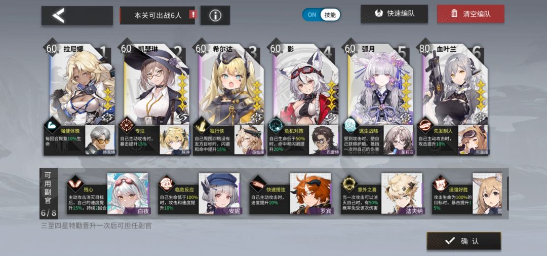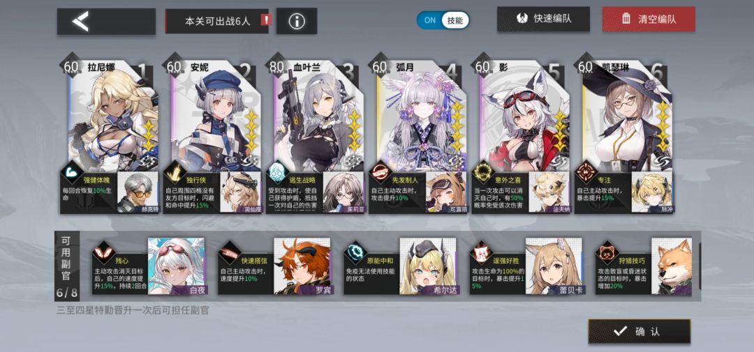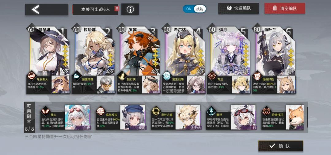 二次晋升:血叶兰80(6级武器)+凯瑟琳60(6级武器)+影60+拉尼娜60+英仙座60+弧月60(可换aoe输出)+安妮60(可换腿长突击)