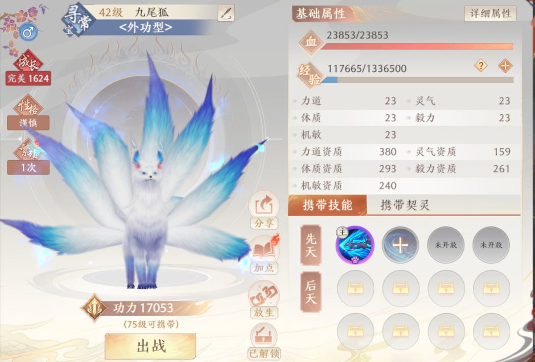 这是我用归心丹培养的一只完美狐狸,1624成长值也不算太高,一起生的另一只同样也是完美,而且这只完美狐狸真的和另一只一起生了一个9变出来,但是啊!我要说一下,那个9变不是完美的是卓越的!