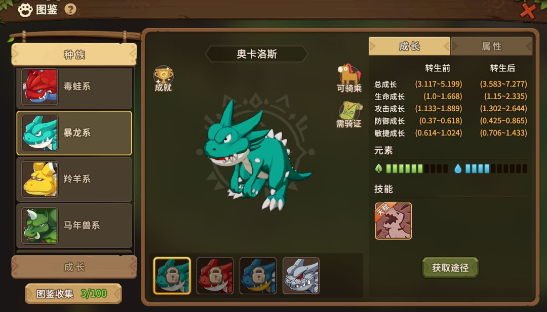 马年兽系总成长极高,在极高成长分类中也是顶尖的存在,自身面板十分优秀。极高的攻击成长外加自带技能怒目,让其能够更稳定地打出伤害,避免被敌人闪避。参与百人道场玩法,成功通关困难100层,可以直接获得绿色马年兽-葛雷基欧,黄马年兽需要打精灵王试炼才有机会获得碎片,大家有空时可以刷刷这些玩法哦~