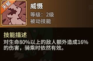自身天赋技能为威慑,对高血量敌人有高额增伤,可以理解为先手爆发伤害极高,因此配合强势的主动技能,在开局便能对敌人造成极高的伤害。
